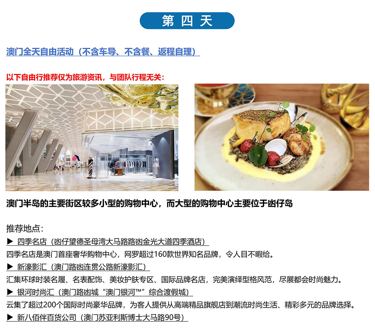 酒店 :香港四钻酒店2晚、澳门四钻1晚(单人占半间)