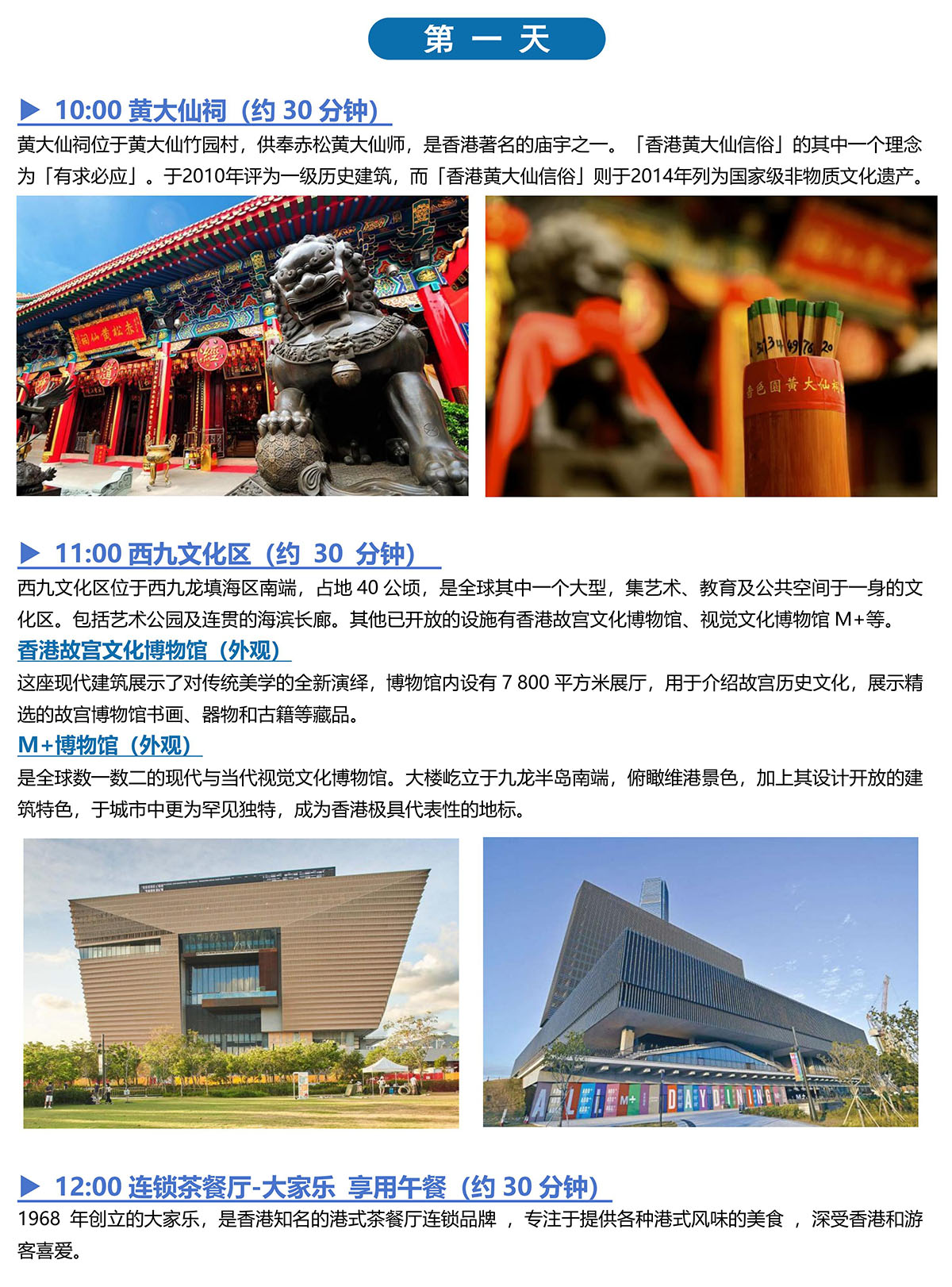 <港澳四天游(香港观光+迪士尼+澳门+自由行)>黄大仙祠、尖沙咀钟楼&星光大道 、太平山顶、金紫荆广场、迪士尼乐园、 大三巴牌坊 ➤ 妈祖庙、渔人码头、威尼斯人度假村