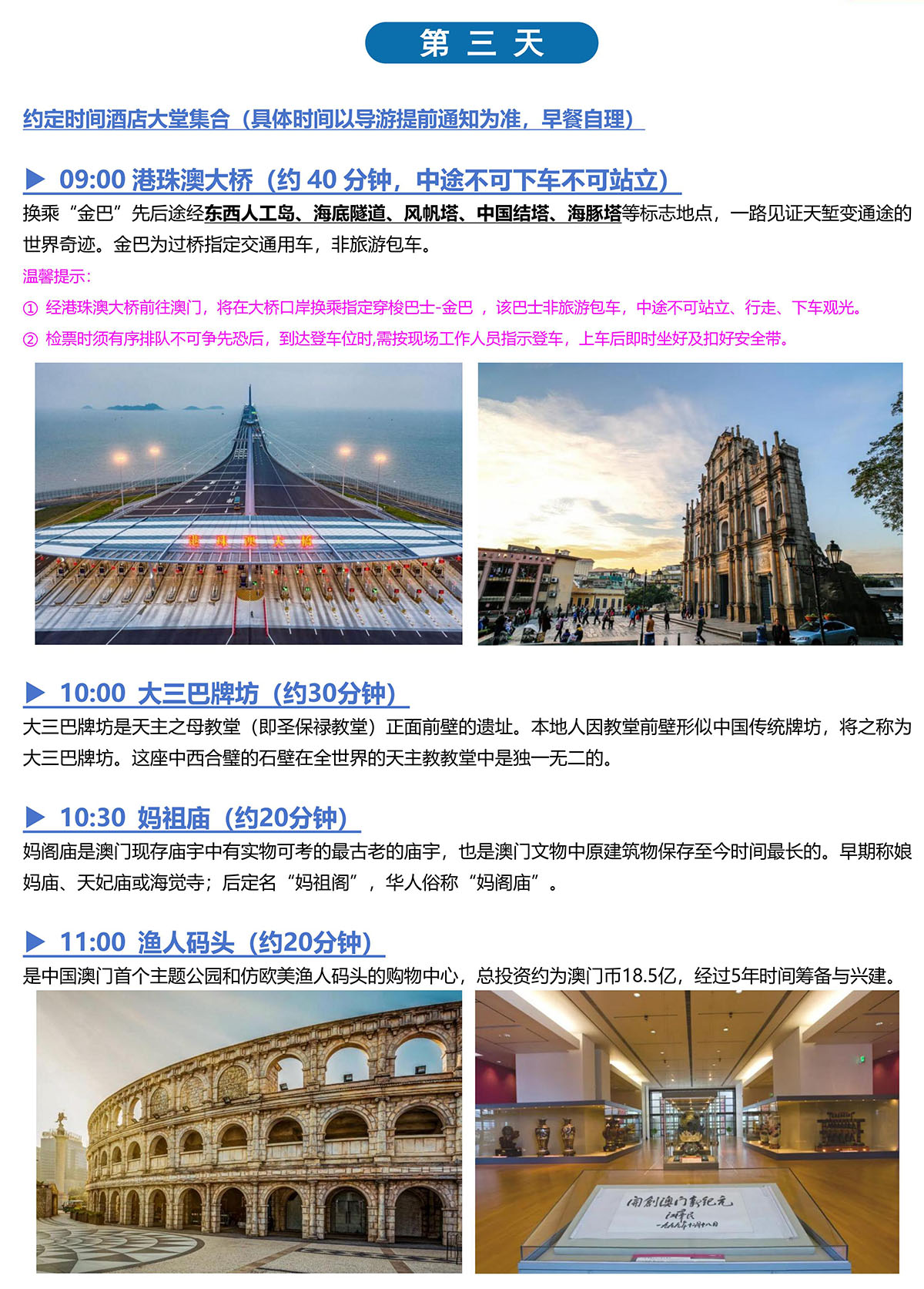 2、参加港澳游线路,请出发前提前1天或以上提供出行者的姓名、通行证号、联系电话(开通国际漫游功能)。