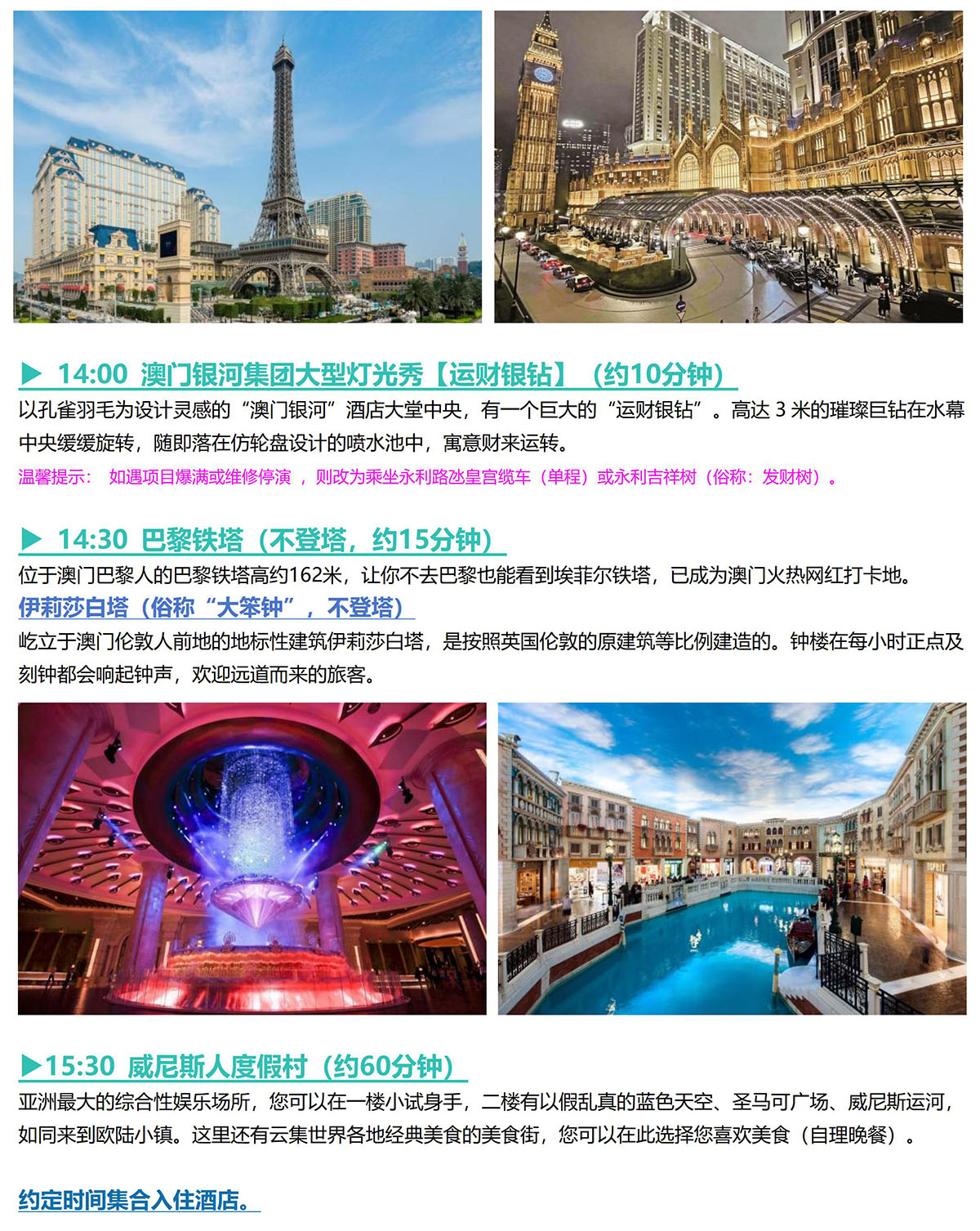 <澳门经典观光、自由行两日游>大三巴牌坊、妈祖庙、渔人码头、澳门回归贺礼陈列馆、澳门银河运财银钻、巴黎塔&伦敦人、威尼斯人度假村