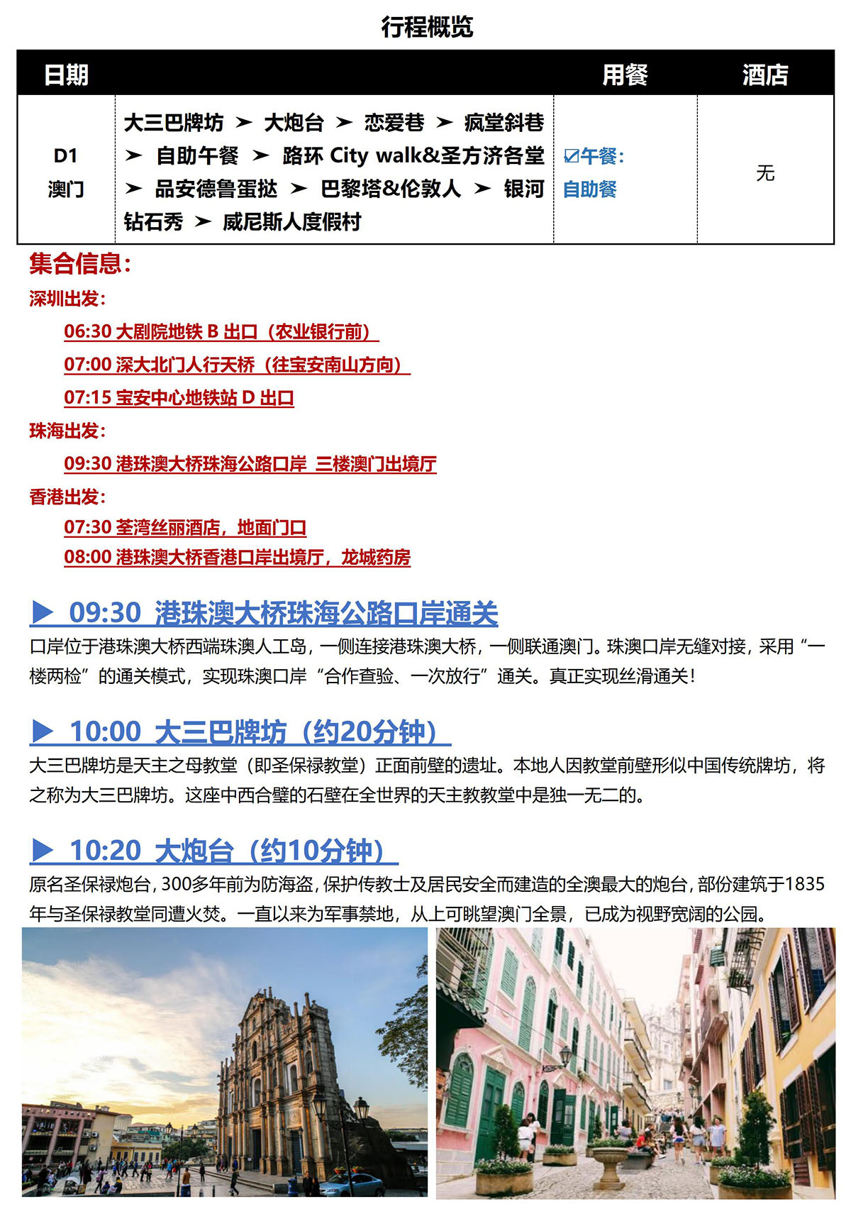 <澳门精品小团一日游>大三巴牌坊、大炮台、恋爱巷、疯堂斜巷、品安德鲁蛋挞、巴黎塔&伦敦人、银河钻石秀、威尼斯人度假村