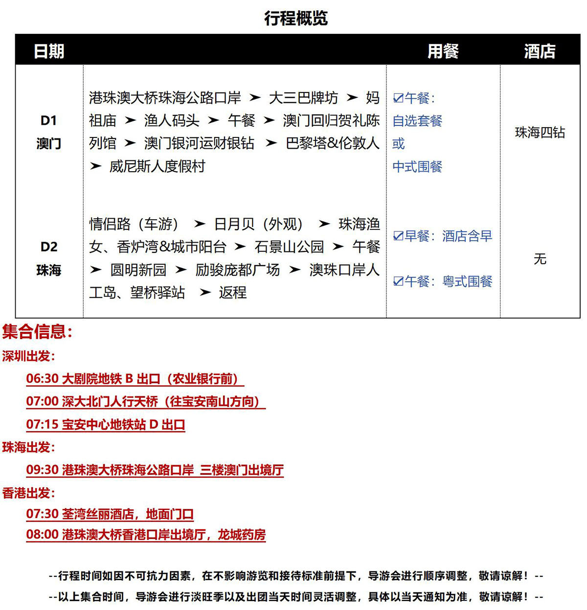 一、证件:必须持有效港澳通行证及有效签注参团并确保资料准确。如持其他证件,出入境风险由游客自行承担。